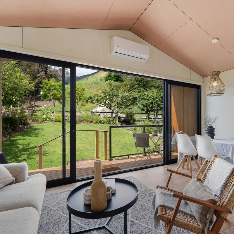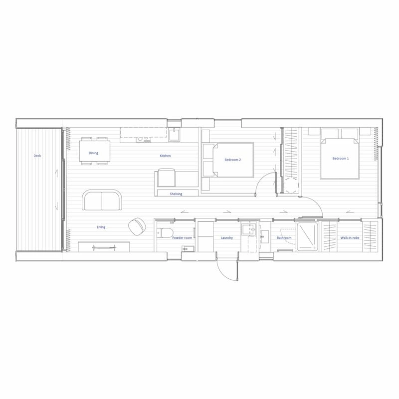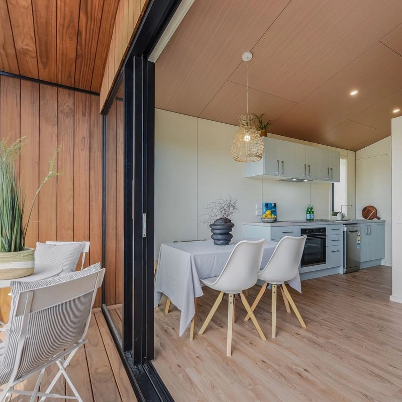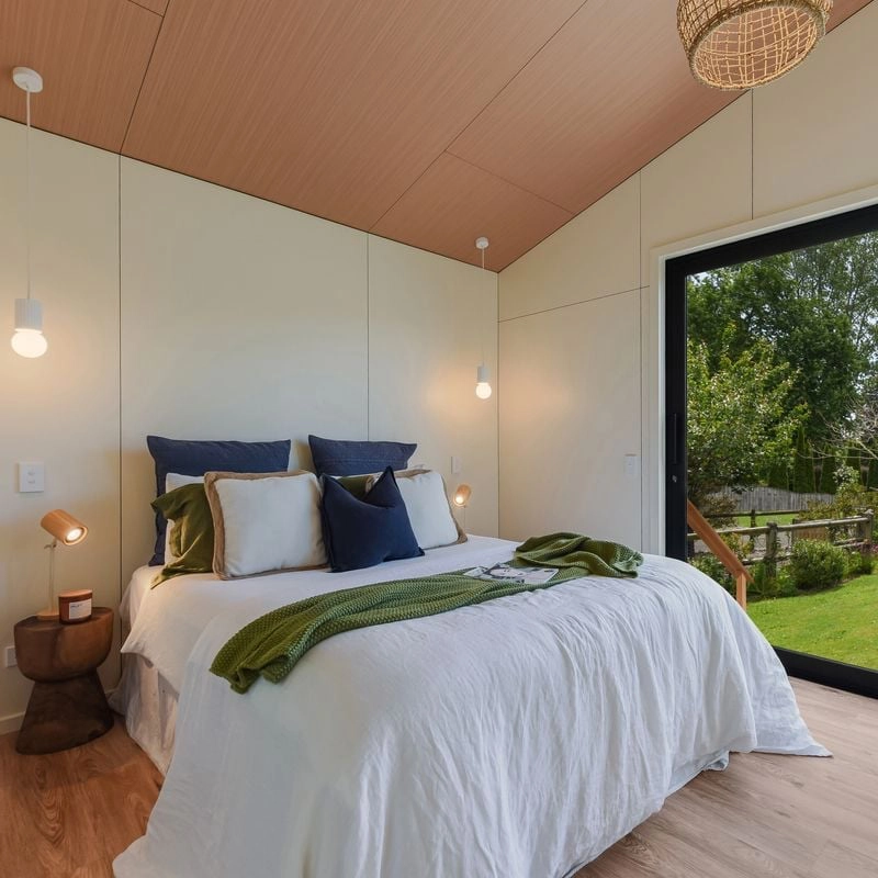 The Kerry invites you to enjoy spacious, effortless living within a thoughtfully designed 60m² layout. A master bedroom with walk-in wardrobe and a generous second bedroom offer comfort and privacy, while clever storage and a separate laundry make everyday living simple. Light floods the open-plan living area through large sliding doors, with soaring raked gable ceilings enhancing the sense of space and calm. Step outside to a generous 9.9m² deck, perfect for relaxing or